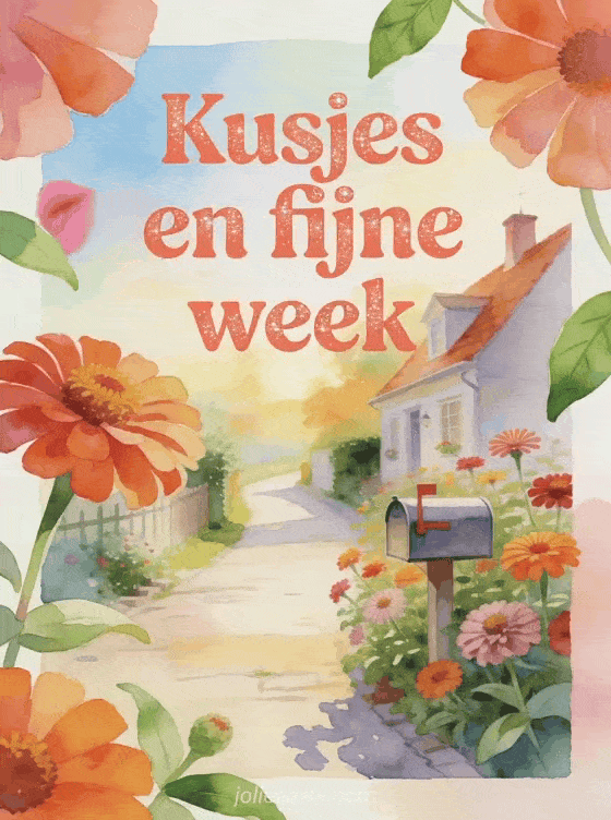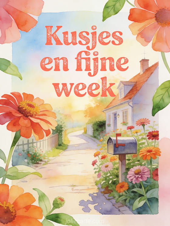 Stuur een fijne week gif-kaart met een dorpspad, een kleine brievenbus en heldere zinnia's in warm ochtendlicht. Ontdek ook een fijne week voor jou ook kusjes, fijne week dikke kus of kusjes voor de hele week.