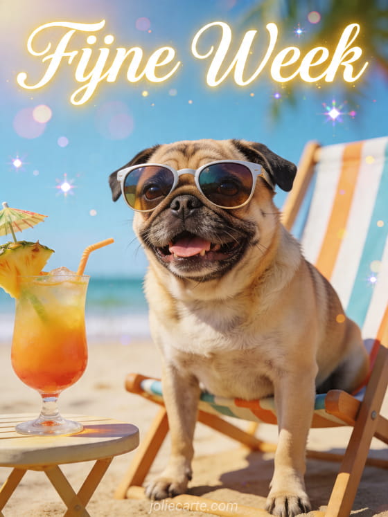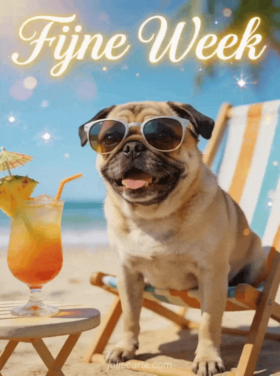 Wens iemand een ontspannen en leuke week met deze humoristische kaart waarop een gekke mopshond met oversized zonnebril op een strandstoel zit naast een tropische cocktail. Ontdek ook fijne week kusjes gif, fijne week bericht of glitterende fijne week gif.