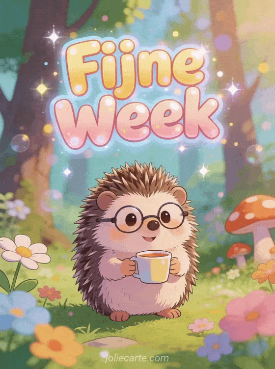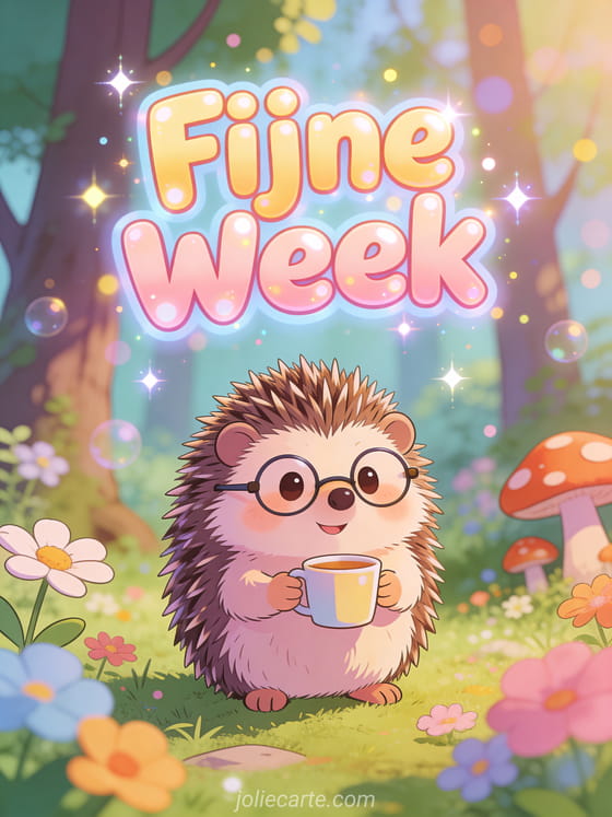 Stuur een hilarische fijne week humor wens met een schattige egel met kleine brilletjes die een kopje vasthoudt in een sprookjesachtig boswezen setting. Ontdek ook een fijne week gif kaart.