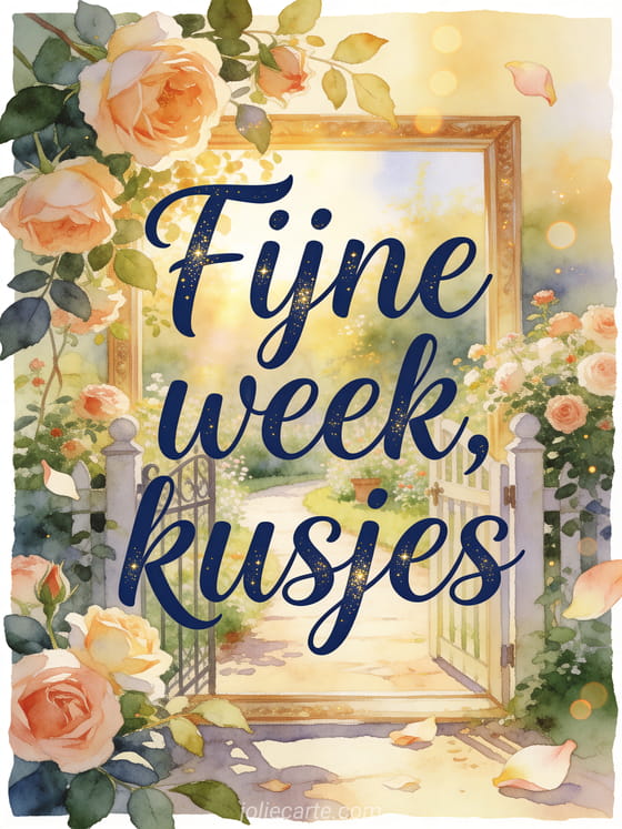 Stuur fijne week kaart kusjes met vloeiende marineblauwe aquarelletters, een zonnig tuinpad, oude rozen en een kleine tuinpoort. Deel ook een kaart voor hart kusjes van de week, een kaart voor kusjes tederheid fijne week of een kaart voor mooie afbeeldingen fijne week kusjes.