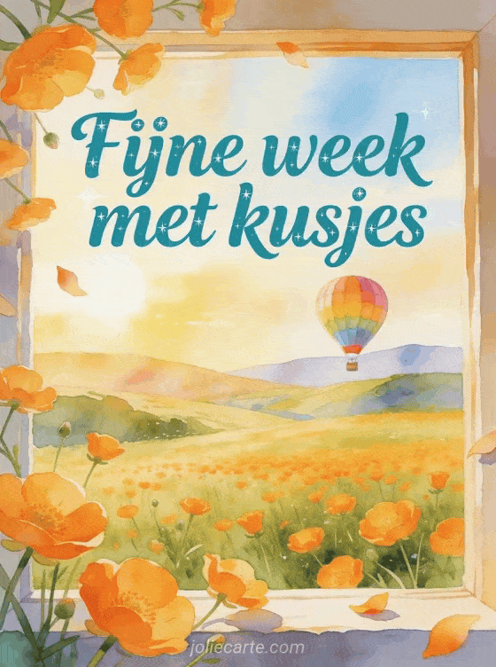 Stuur een vrolijke kaart fijne week met een weide vol boterbloemen en een kleurrijke luchtballon boven de heuvels. Ontdek ook een fijne week gif kusjes, een fijne week voor jou ook kusjes of een fijne week dikke kus.