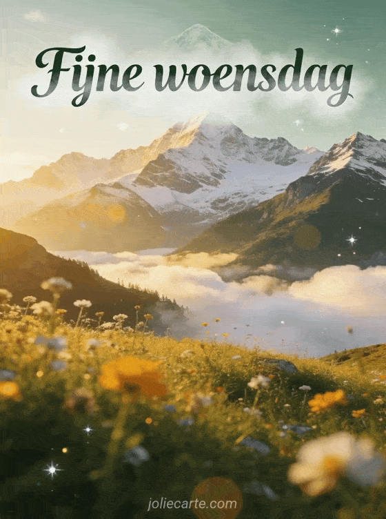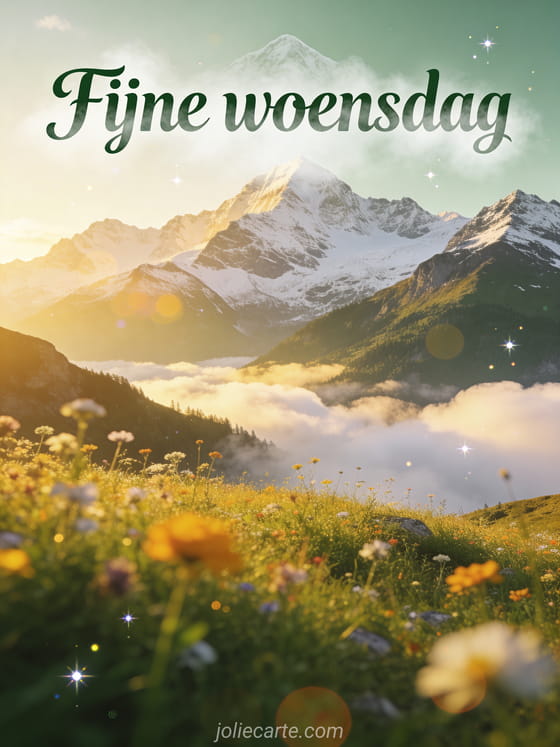 Stuur een rustige fijne woensdag groet met besneeuwde Alpentoppen, een wilde bloemenweide en gouden ochtendlicht boven drijvende wolken. Ontdek ook geanimeerde fijne woensdag afbeeldingen, goedemorgen mijn mooie woensdag of goedemorgen het is woensdag.