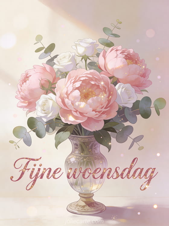 Stuur een romantisch boeket voor fijne woensdag met roze pioenrozen, witte rozen en eucalyptus in een vintage glazen vaas. Ontdek ook fijne woensdag kusjes geanimeerde gif, fijne woensdag grappige humor afbeelding of fijne woensdag kat gif.