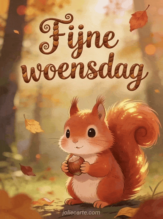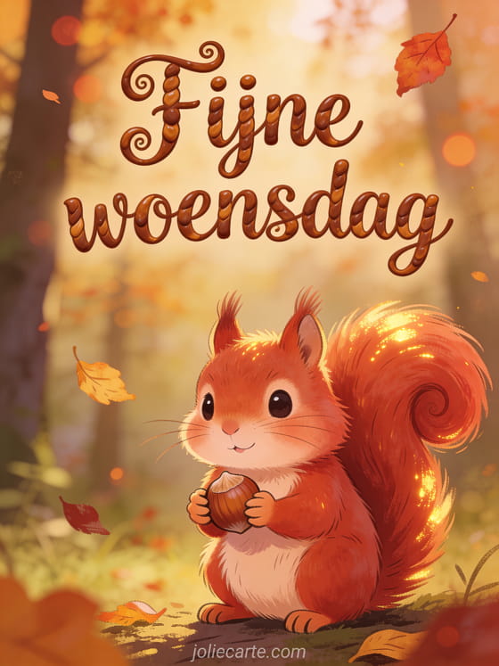 Stuur een schattige fijne woensdag groet met een pluizige rode eekhoorn die een hazelnoot vasthoudt, met zijn volle staart gekruld in warm herfstboslicht. Ontdek ook fijne woensdag geanimeerde gif, elke dag denk ik aan jou yosa prod of hart hart tederheid fijne woensdag kusjes.