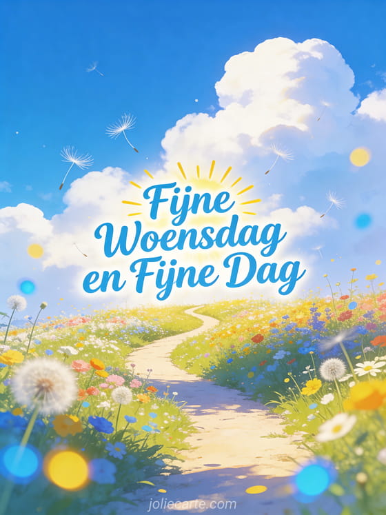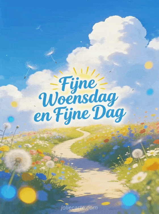 Maak iemands woensdag mooier en wens hem een fijne dag met deze zonnige kaart van een kronkelend pad door een kleurrijke bloemenwede. Ontdek ook fijne woensdag grappig plaatje of afbeelding fijne zonnige woensdag.