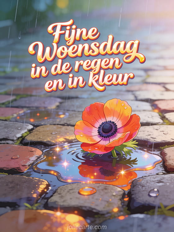 Deel een kleurrijke regenachtige woensdaggroet met levendige letters, glanzende accenten, een heldere anemoon op door regen gekuste kasseien, glinsterende plassen en warm licht. Bekijk ook fijne woensdag met wind, goedemorgen fijne woensdag afbeeldingen of fijne woensdag kusjes kaart.