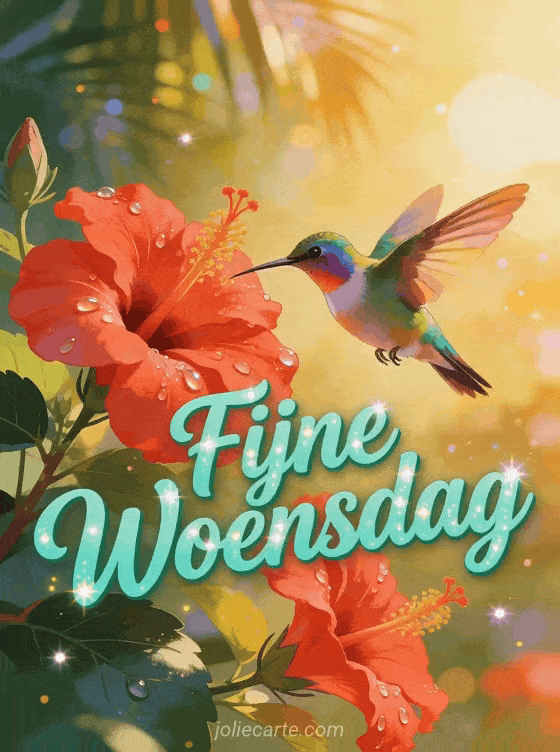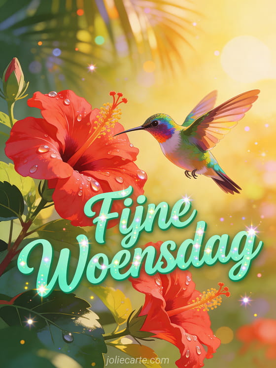 Stuur een prachtige fijne woensdag afbeelding via deze gratis wenskaart. Een kleurrijke kolibrie zwevend bij heldere rode hibiscusbloemen, tropische levendige kleuren met goudkleurig zonlicht, levendig zomersfeer met dauwdruppels op de bloemblaadjes. Bekijk ook een fijne woensdag of een afbeelding goedemorgen en fijne woensdag.