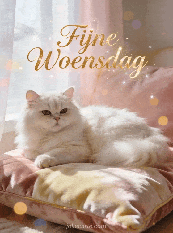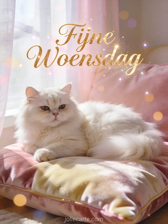 Wens iemand een fijne woensdag met deze gezellige kaart met een pluizige witte Perzische kat op een fluwelen kussen. Ontdek ook humor goedemorgen fijne woensdag of afbeelding fijne woensdag vrienden.