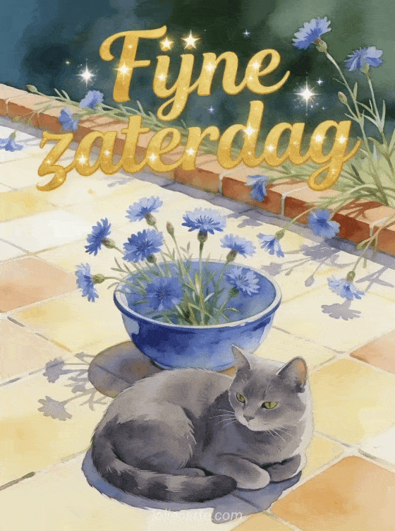 Deel een vrolijke fijne zaterdag boodschap met een Russisch blauwe kat, een blauwe keramische kom, heldere korenbloemen en een zonnig betegeld terras. Stuur ook een mooie afbeelding voor fijne zaterdag en fijn weekend, een fijne zaterdag sneeuw afbeelding of fijne zaterdag geanimeerde gifs.