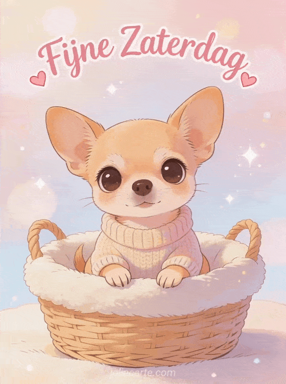 Maak iemands zaterdag bijzonder met deze hartenwarmende kaart van een schattige chihuahua met gigantische ogen in een gezellige mand. Ontdek ook fijne zaterdag of kaart fijne zaterdag humoristisch.