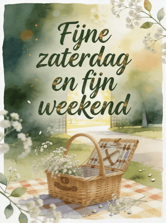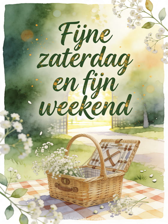 Wens fijne zaterdag en fijn weekend met een aquarel picknickmand, een geruite deken, luchtig gipskruid en een zonnig parkpad. Ontdek ook een kaart met fijne zaterdag zen afbeelding, fijne zaterdag tekst of fijne zaterdag vrienden afbeelding.