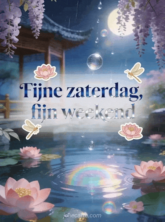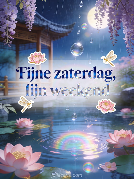Deel een rustige fijne zaterdag en een fijn weekend met een paviljoen in een Aziatische tuin, paarse blauwe regen, roze lotusbloemen en gouden libellen in zomerse regen. Ontdek ook fijne zaterdag en fijn weekend, een fijne zaterdag afbeelding of fijne zaterdag afbeeldingen.