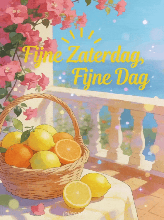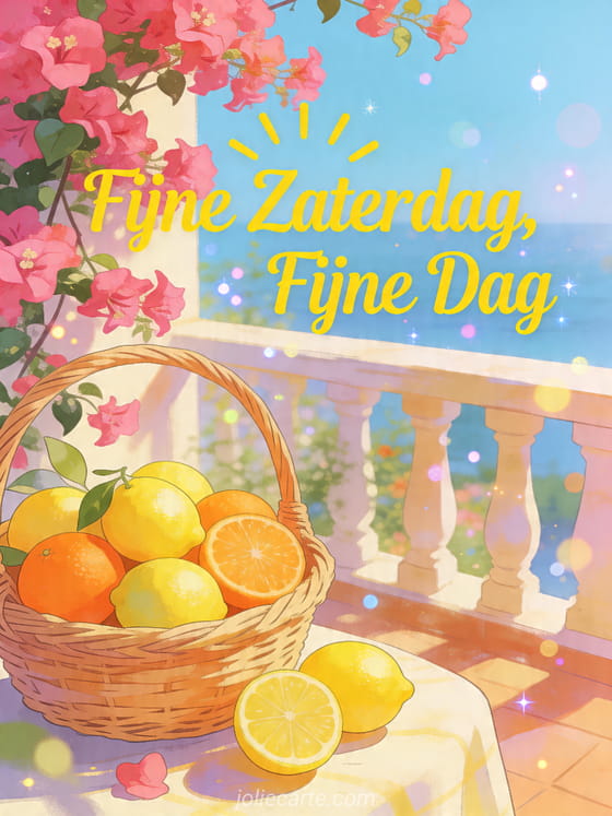 Stuur een stralende Fijne zaterdag, fijne dag met deze gratis kaart vol citroenen, sinaasappels en mediterrane zon. Ontdek ook fijne zaterdag mooie afbeeldingen fijn weekend, kaart fijne zaterdag gratis of fijne zaterdag het regent.