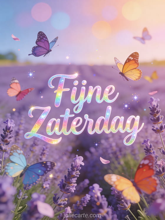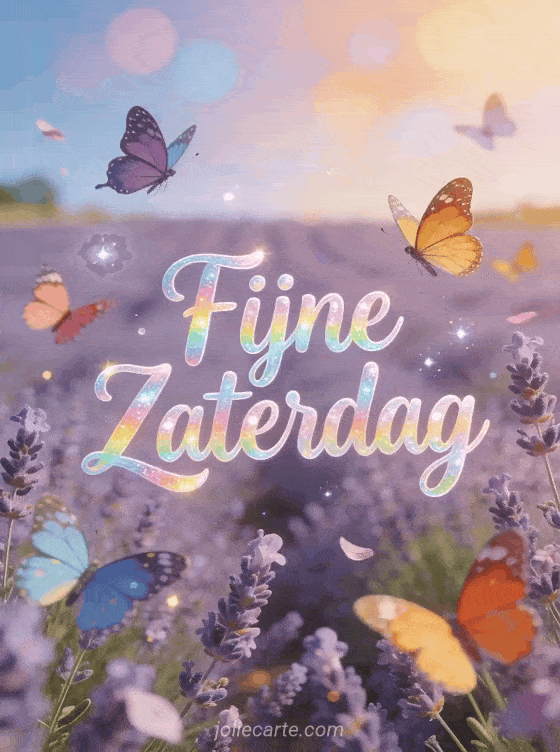 Deel een vrolijke zaterdagswens met deze geanimeerde gif met vrolijke vlinders die dansen rond lavendelvelden. Ontdek ook foto's fijne zaterdag of fijne zaterdag humor voor meer zaterdagsinspiratie.