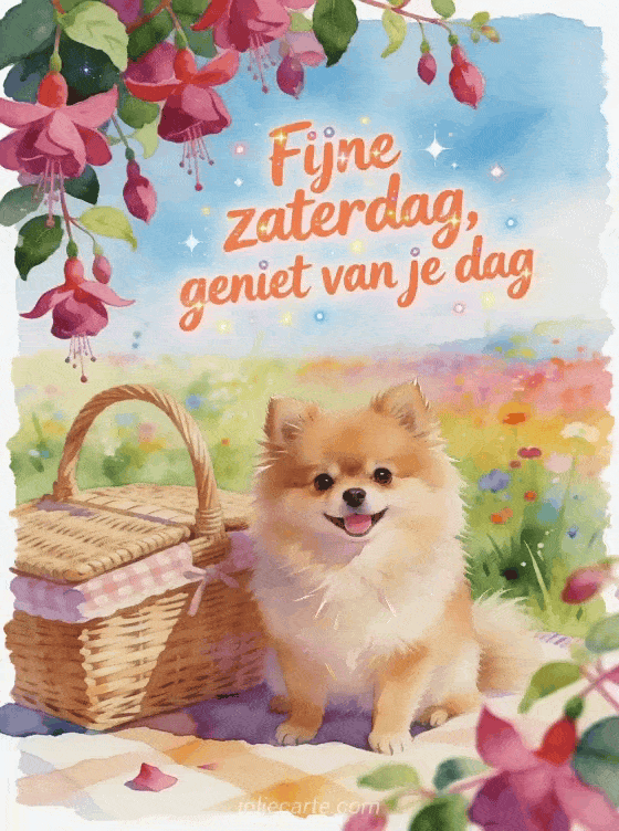 Deel een fijne zaterdag geanimeerde gif met koraalkleurige letters, een mini Dwergkees, een rieten picknickmand en hangende fuchsiabloemen in een levendige weide. Je kunt ook heel fijne zaterdag gif, gratis afbeeldingen fijne zaterdag en fijn weekend of fijne zaterdag en weekend afbeelding sturen.