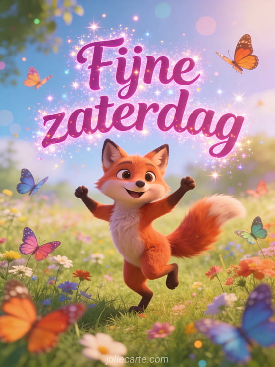 Deel een leuke fijne zaterdaggroet met een schattige vos die vrolijk danst in een weide met wilde bloemen, omringd door kleurrijke vlinders en in 3D-cartoonstijl. Ontdek ook mooie goedemorgen zaterdag afbeeldingen, een fijne zaterdag dikke kusjes afbeelding of goedemorgen fijne zaterdag.