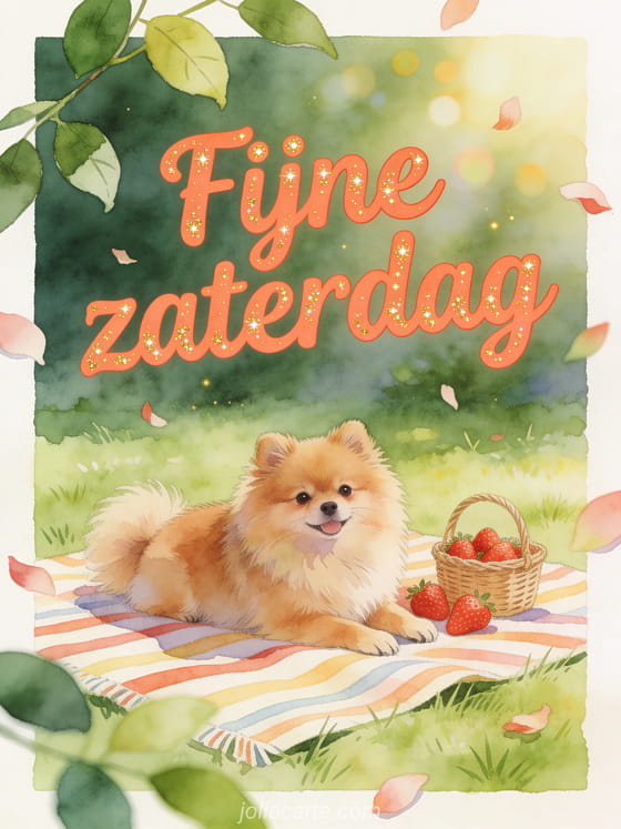 Deel fijne zaterdag gifs met koraalkleurige letters, een pluizige Dwergkees naast een gestreept picknickkleed, aardbeien en een rieten mand op een zonnig gazon. Je kunt ook een fijne zaterdag citaat afbeelding, een heel mooie fijne zaterdag afbeelding of fijne zaterdag kusjes gifs sturen.