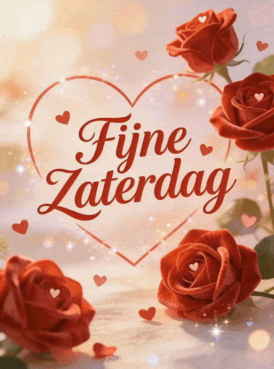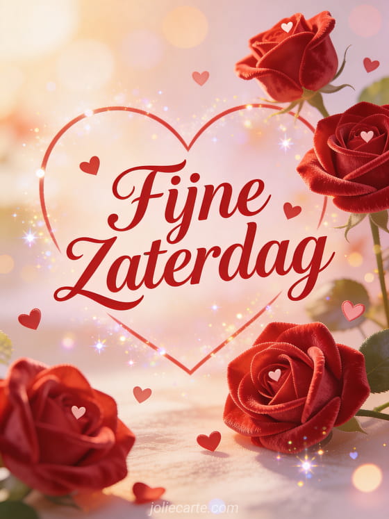 Stuur een romantische fijne zaterdag wens met rode fluwelen rozen met kleine hartjes. Ontdek ook een fijne zaterdagdag kaart of een fijne zaterdag kusjes kaart.