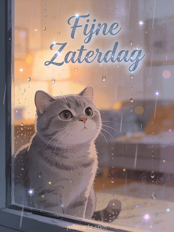 Deel een gezellige zaterdaggroet met deze schattige kaart met een Britse korthaar kat die naar de regen kijkt. Ontdek ook een goedemorgen zaterdag citaat kaart of een mooie kaart fijne zaterdag.
