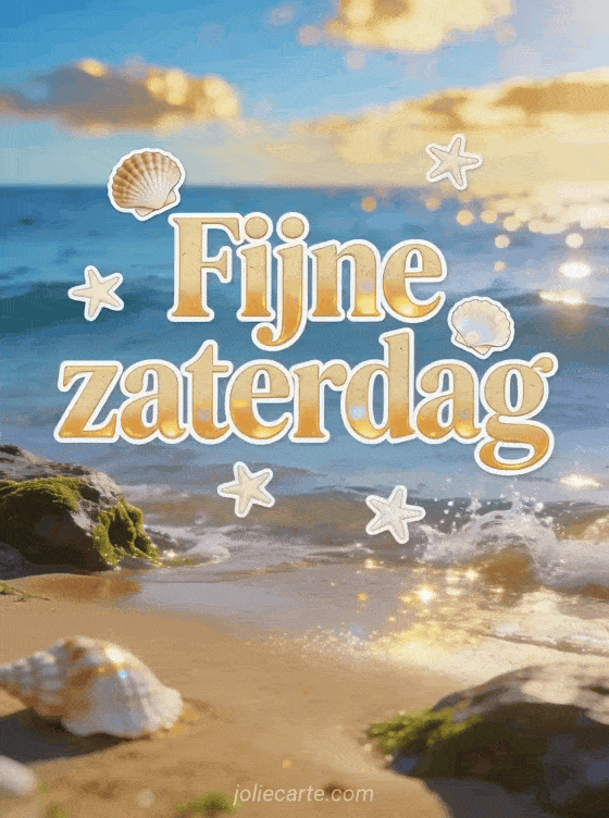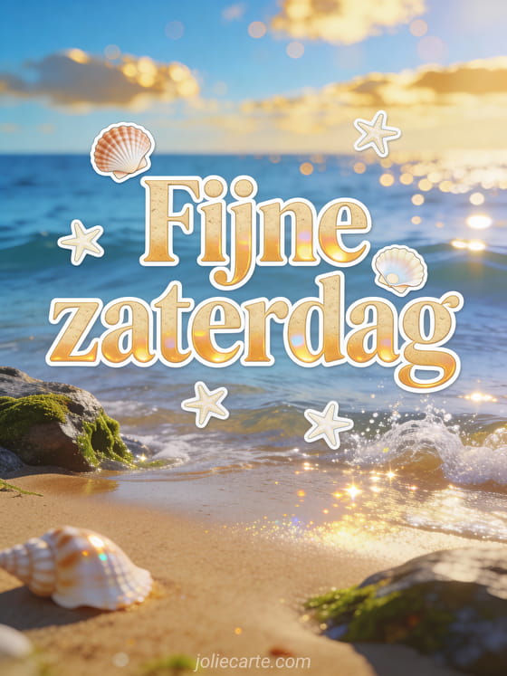 Stuur een kalmerende kaart voor fijne zaterdag met goudzandkleurige letters, schelpen, zeesterren, zachte golven die breken op bemoste rotsen, glinsterend opspattend water en een blauwe lucht met gouden wolken. Ontdek ook gifs fijne zaterdag, fijne stille zaterdag of gratis fijne zaterdag afbeelding.