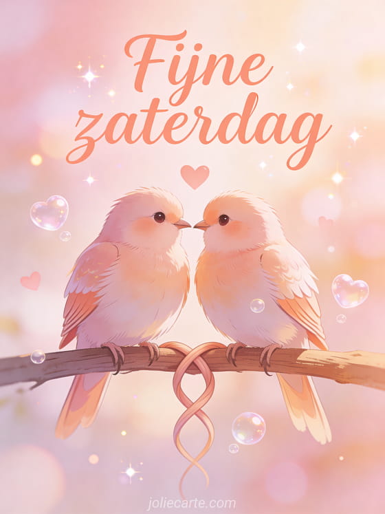 Deel een fijne zaterdag kusjes afbeelding met twee onafscheidelijke vogels op een gedeelde zitstok, omringd door perzikkleurig schrift en hartbubbels in een zoete ochtendscène. Stuur meer zaterdagliefde met fijne zaterdag gratis afbeelding, gratis virtuele kaart fijne zaterdag of goedemorgen zaterdag afbeelding.