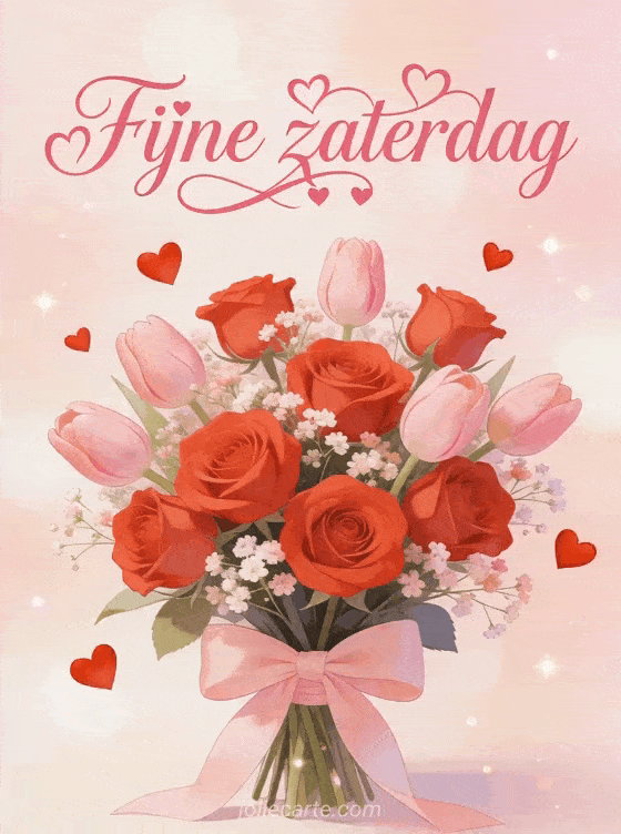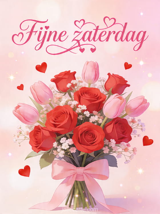 Deel een lieve fijne zaterdag groet met een boeket rozen en tulpen om de dag mooier te maken. Ontdek ook fijne zaterdag koffie kusjes, fijne zaterdag en fijn weekend en gelukkig nieuwjaar 2017 bretons.