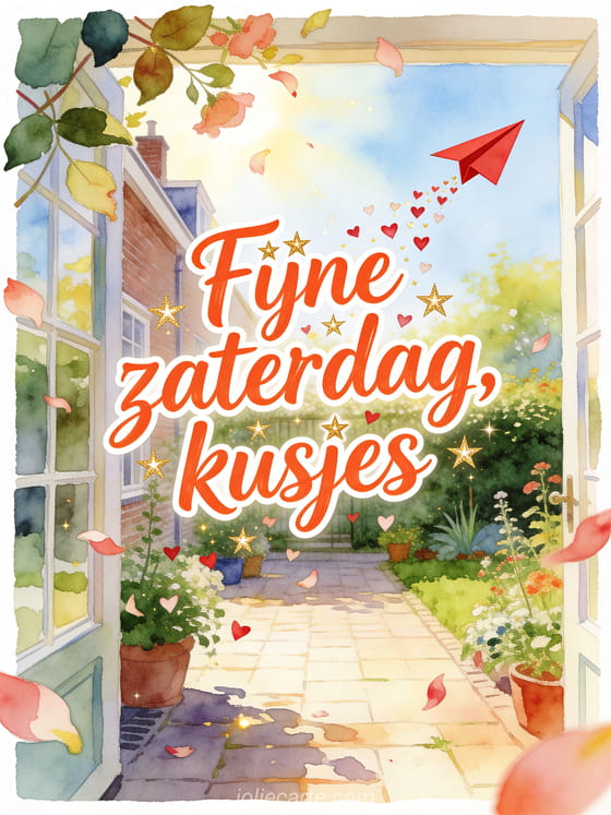 Deel fijne zaterdag en kusjes met een rood papieren vliegtuigje dat hartconfetti door een zonnige aquareltuin draagt. Stuur deze liefdevolle groet en ontdek ook fijne zaterdag mijn vriend afbeelding, fijne zaterdag fijn weekend gif of fijne zaterdag bewegende beelden.