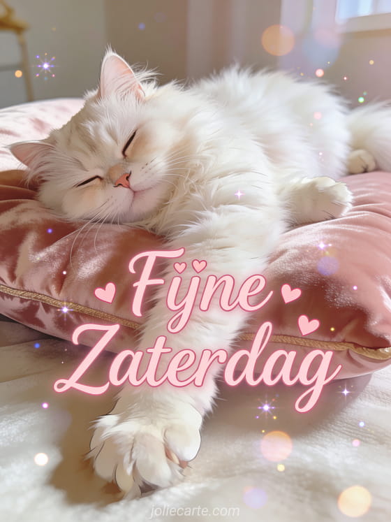 Stuur een zachte fijne zaterdag kusjes wens met een pluizige witte Perzische kat liggend op een fluwelen kussen. Ontdek ook een fijne zaterdag voor jou kaart of een fijne zaterdag humor weekend kaart.