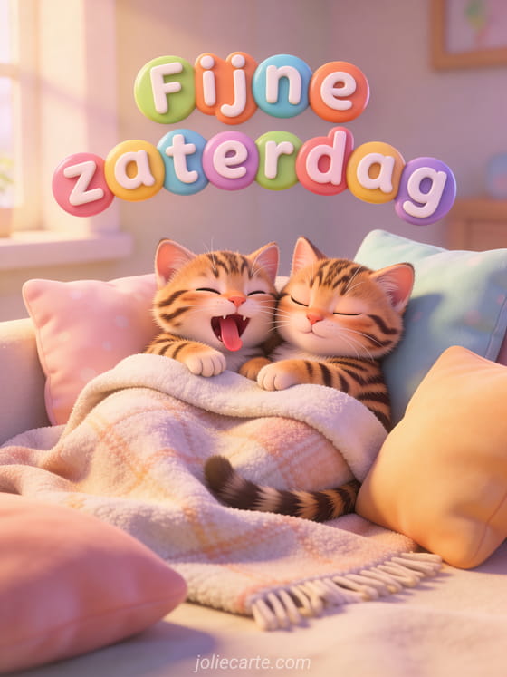 Deel fijne zaterdag met de katten in een warme 3D-illustratie met kleurrijke ronde letters, twee schattige tijgerkittens samen op een gezellige plaid, zachte kussens en zacht ochtendlicht. Ontdek ook zaterdag kusjes afbeeldingen of fijne zaterdagavond kusjes.