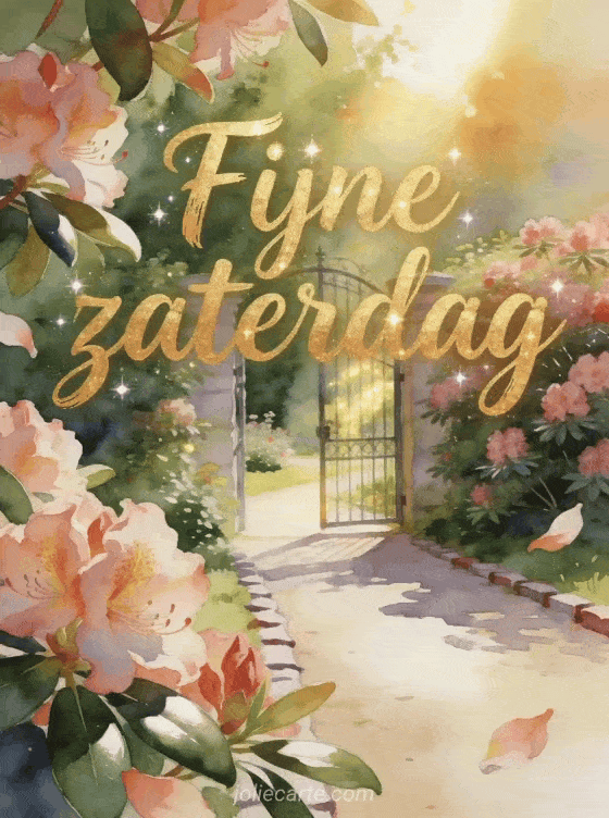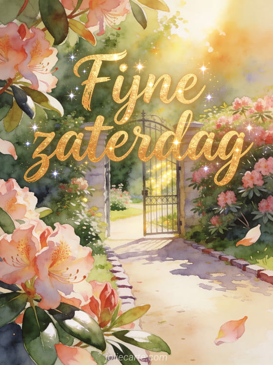 Deel een vrolijke fijne zaterdag met warme gouden letters, een zonnige tuinpoort en weelderige rododendron. Deze gratis kaart voegt sprankelende accenten, glanzende bladeren en een zacht tuinpad toe voor een helder weekendmoment. Bekijk ook een fijne zaterdag dikke kus gif kaart, een gratis goedemorgen zaterdag afbeelding of mooie fijne zaterdag afbeeldingen.