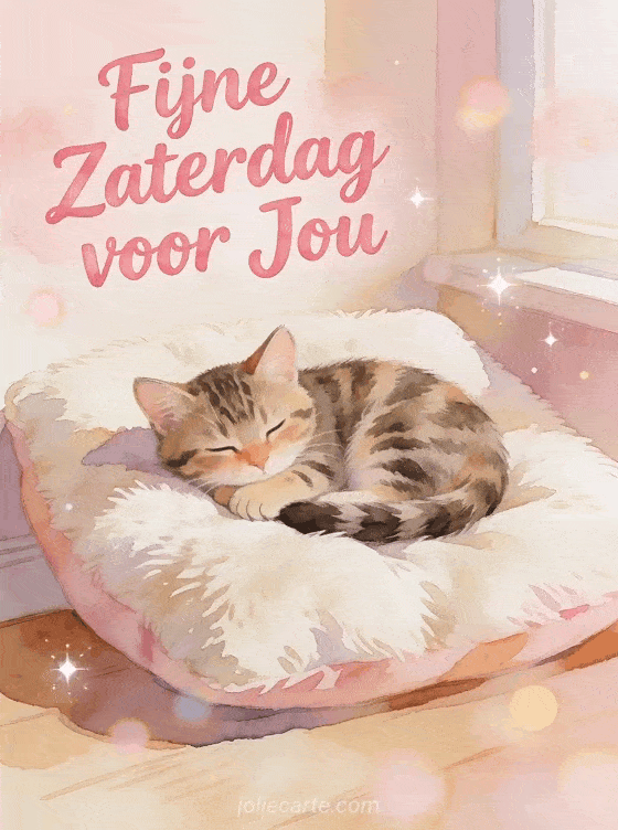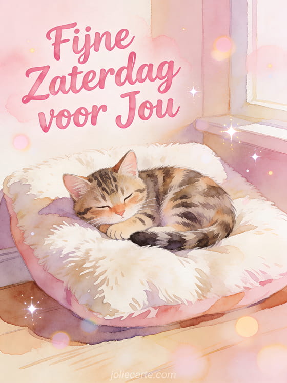 Stuur een tedere fijne zaterdag voor jou wens met een schattige tabby kitten opgerold op een zacht kussen in een warm interieur. Ontdek ook een fijne zaterdag humor weekend kaart of een geanimeerde fijne zaterdag kaart.