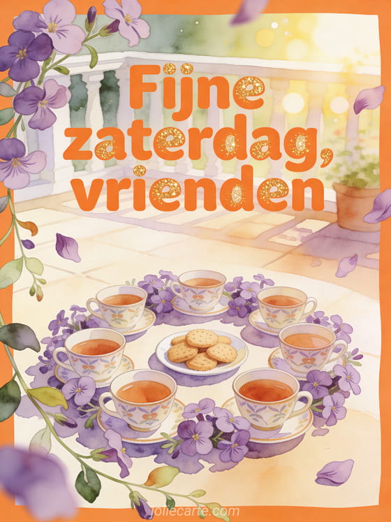 Deel een gezellig zaterdagmoment met een aquarelkaart met theekopjes met patroon, een klein bord koekjes en paarse aubrieta op een zonnig terras. Je kunt ook goedemorgen fijne zaterdag afbeelding sturen, fijne zaterdag geanimeerde gif kiezen of heel fijne zaterdag gif delen.