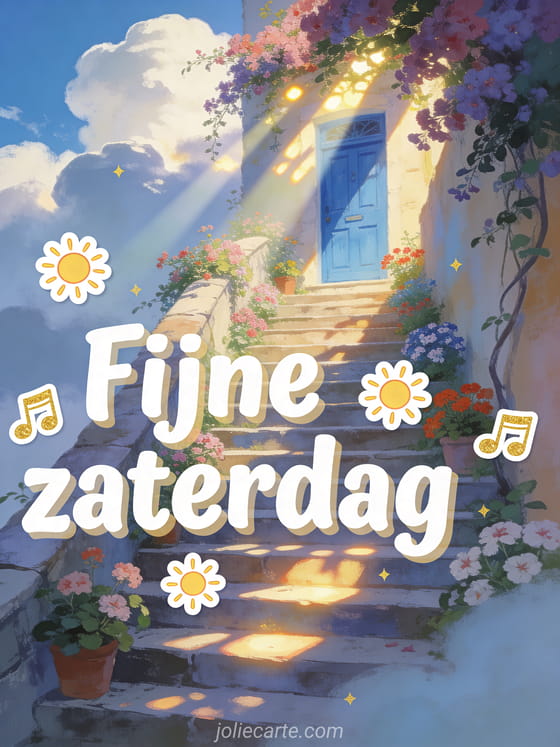 Verstuur fijne zaterdag vrienden gifs met vrolijke witte letters, kleine zonnetjes, gouden muzieknoten en een bloementrap naar een blauwe mediterrane deur. Deel een vrolijke weekendwens en ontdek ook vriendschap fijne zaterdag fijn weekend, goedemorgen fijne zaterdag kusjes of landschap fijne zaterdag landschap.