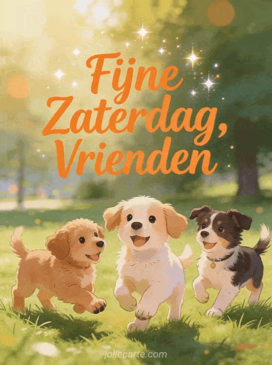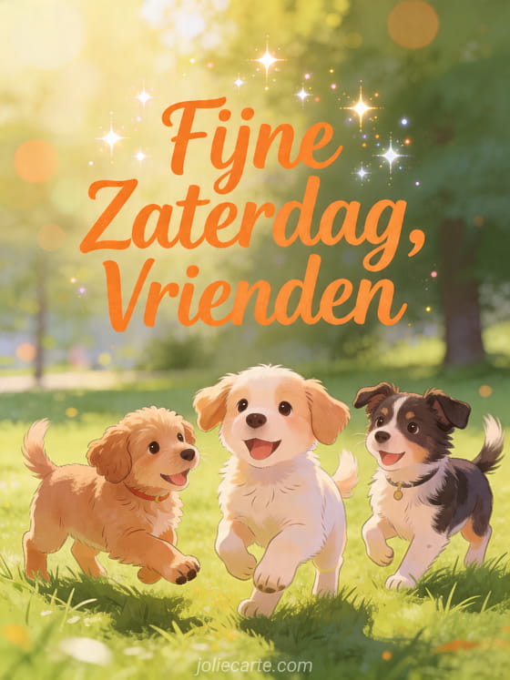 Deel een vrolijke Fijne zaterdag, vrienden met deze gratis kaart waarop schattige puppy's samen spelen in een zonnig park. Ontdek ook grappig fijne zaterdag humoristisch, grappige fijne fijne zaterdag humor of fijne zaterdag en fijn weekend citaat.