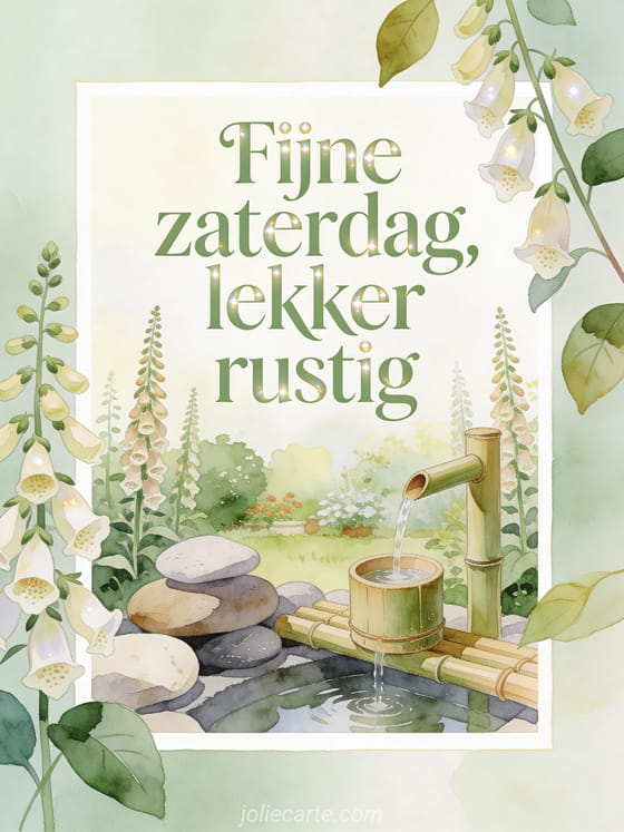 Deel een serene aquareltuinhoek met gladde rivierstenen, een bamboefontein, hoog vingerhoedskruid en zacht gouden licht. Ontdek ook fijne zaterdag tekst, fijne zaterdag vrienden afbeelding of goedemorgen fijne zaterdag afbeelding.