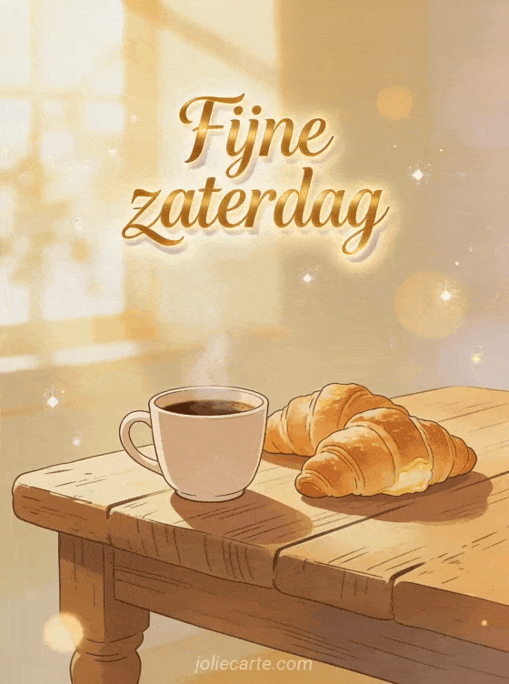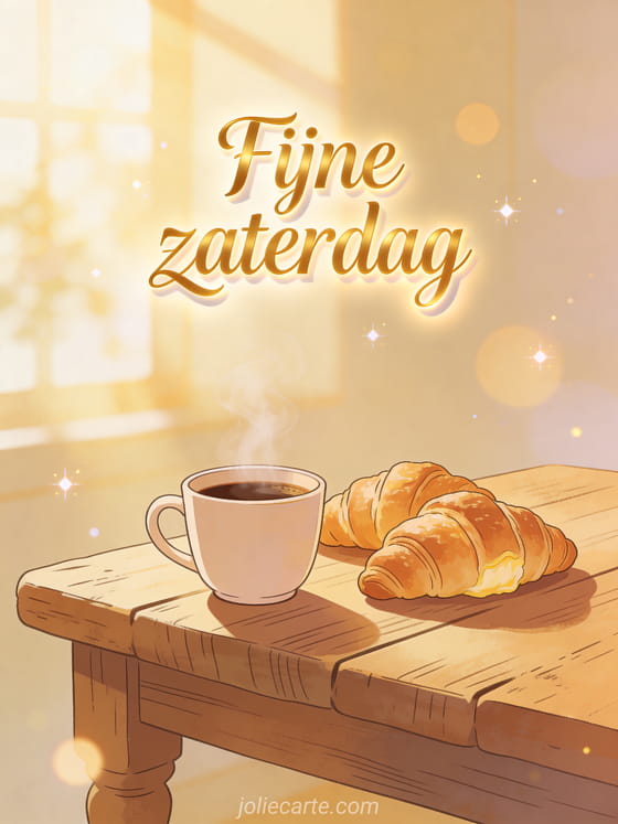 Wens iemand een prachtige zaterdag met deze warme kaart met dampende koffie en verse croissants in gouden ochtendlicht. Ontdek ook een kaart fijne zaterdag humoristisch of een fijne dag fijne zaterdag.