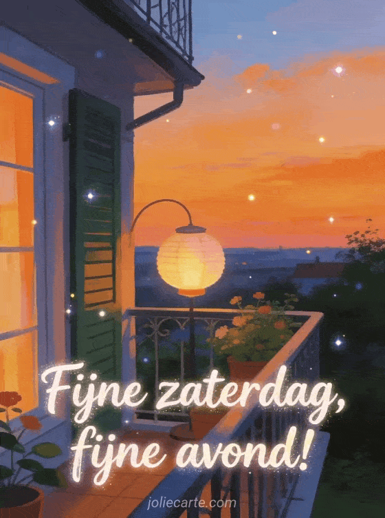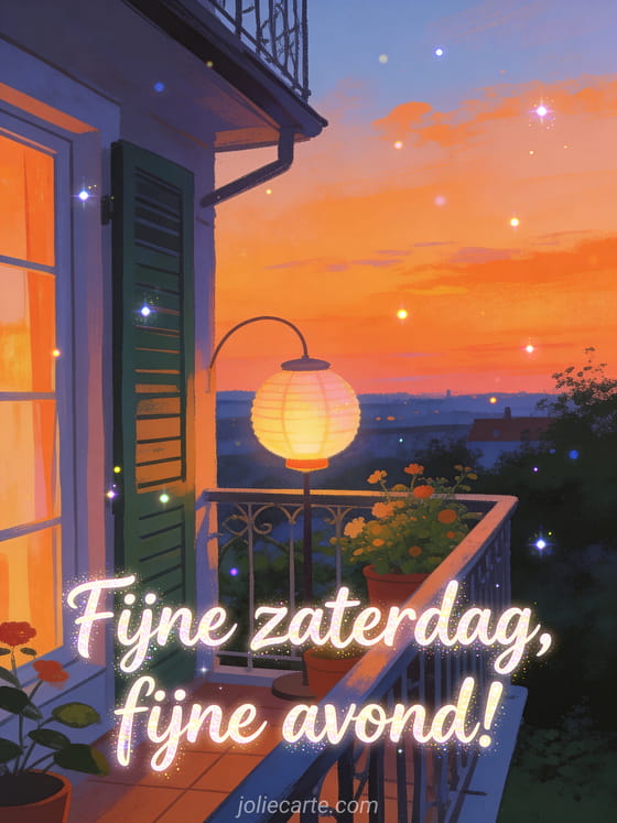 Deel fijne zaterdagavond met speelse letters, een balkon in de schemering, een zachte lamp en een stralende oranje avondlucht. Stuur ook fijne zaterdagochtend, zaterdag fijn weekend of zaterdag fijn weekend fijne zaterdag.