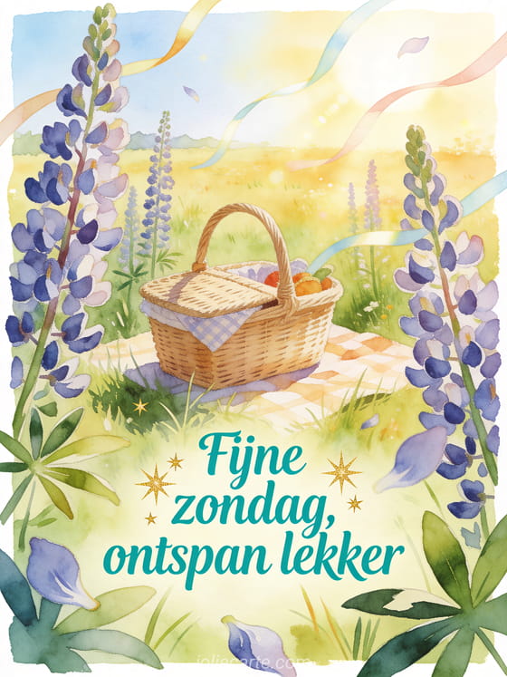 Deel een ontspannen fijne zondag met een picknickmand op een zonnige weide, hoge lupinebloemen, lichtlinten en een vrolijke vrijetijdssfeer. Je kunt ook fijne zondag tekst, fijne zondag honden afbeelding of fijne zondag geanimeerde virtuele kaart delen.