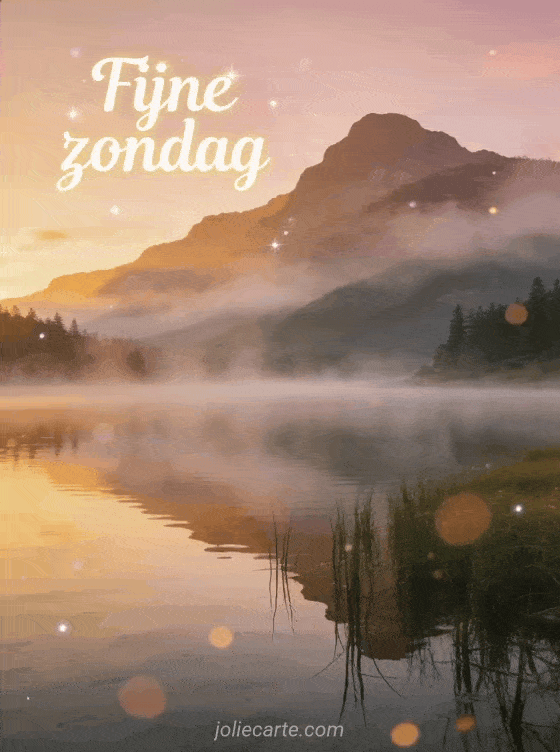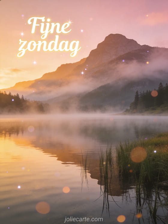 Deel een fijne zondag afbeelding met een sereen meer bij zonsopgang, zachte mist die opstijgt en bergen die in het water weerspiegelen. Stuur meer zondagsrust met fijne zondag kaart, fijne zondag en fijne week bericht of rustgevende fijne zondag afbeelding.