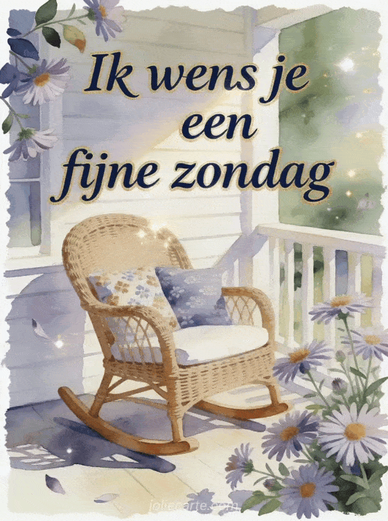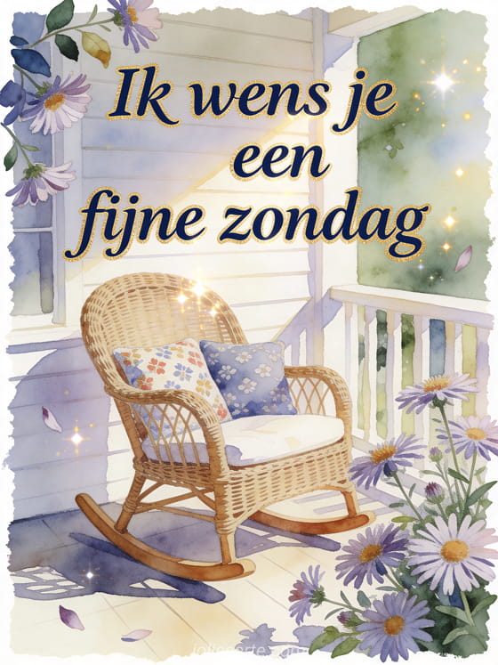 Stuur een vredige fijne zondag groet met een rieten schommelstoel naast asterbloemen op een lichte veranda, met zachte patroonkussens en sprankelend zondaglicht. Ontdek ook een fijne zondag geanimeerde afbeelding, een fijne zondag vrienden gif of een fijne zondag strand gif.