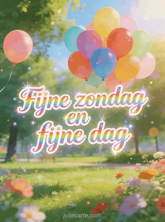 Deel een heldere fijne zondag en fijne dag groet met optimistische sierletters, regenboogfonkels en kleurrijke ballonnen boven een zonnig park. Ontdek ook geanimeerde afbeeldingen voor fijne zonnige zondag, een kaart voor fijne zondag rust of een fijne zondag kusjes gif.
