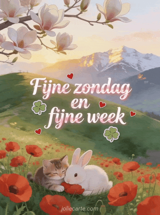 Stuur een tedere kaart voor fijne zondag en fijne week met witte cursieve letters, klavertjes, kleine rode hartjes, rode klaprozen op een heuvel boven een groene vallei, een katje en een konijn dicht tegen elkaar, magnoliabloesem en besneeuwde bergen bij zonsondergang. Ontdek ook rustgevende fijne zondag afbeelding, fijne zondag citaat of fijne zondag vriendschap gif.