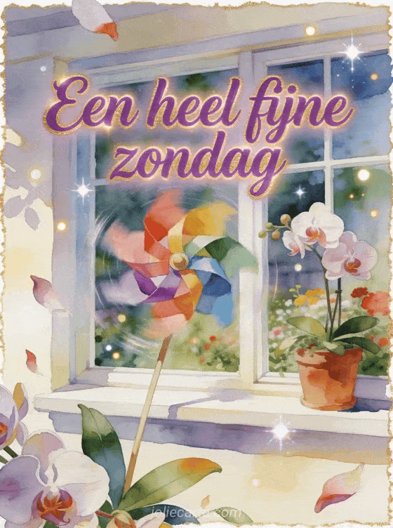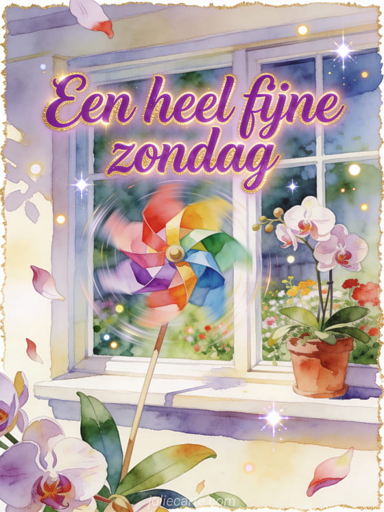 Vier zondag met een heldere aquarelkaart met een kleurrijk papieren windmolentje, orchideeën en een zonnige vensterbank in de tuin. Je kunt ook fijne zondag vrienden gif sturen, fijne zondag strand gif delen of fijne zondag allemaal afbeeldingen kiezen.