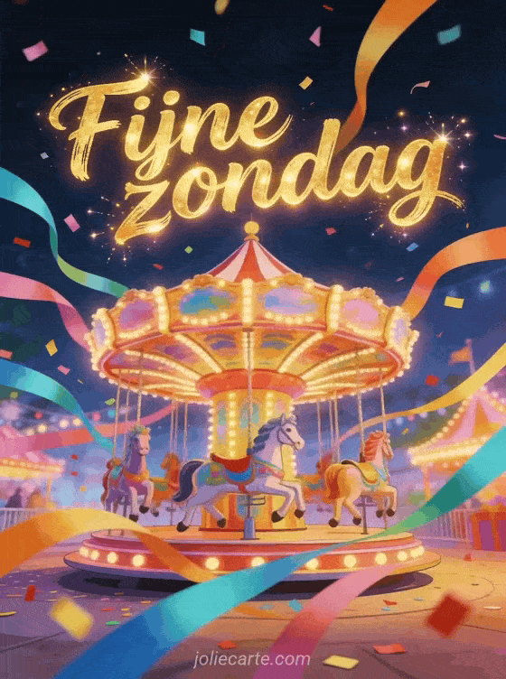 Stuur fijne zondag met een kermiscarrousel onder heldere linten en confetti, vol fonkelende lichten en feestelijke kleuren. Bekijk ook geanimeerde fijne zondag kaart, fijne zondag humor geanimeerde gif of goedemorgen fijne zondag afbeelding.