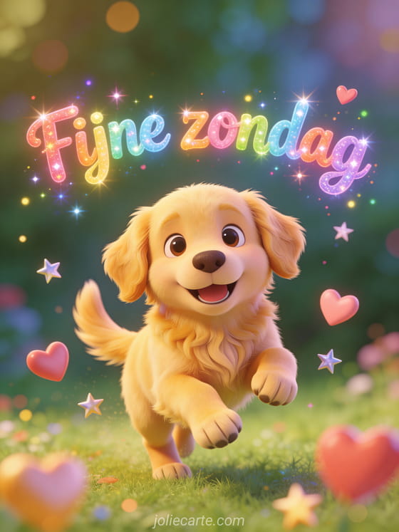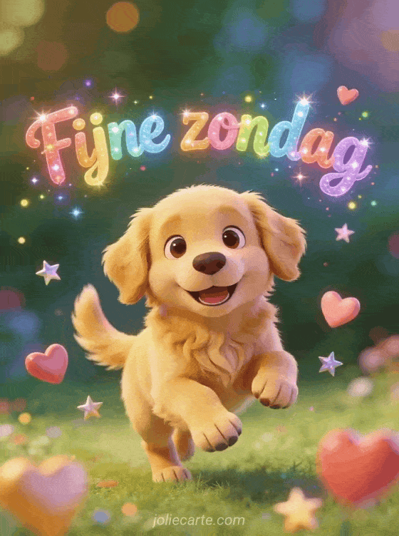 Deel een geanimeerde gif voor fijne zondag met kleurrijke letters, een schattige golden retriever pup die kwispelt, zwevende hartjes en fonkelende sterren. Ontdek ook een fijne zondag mooie kaart of een fijne zondag in de regen humor.