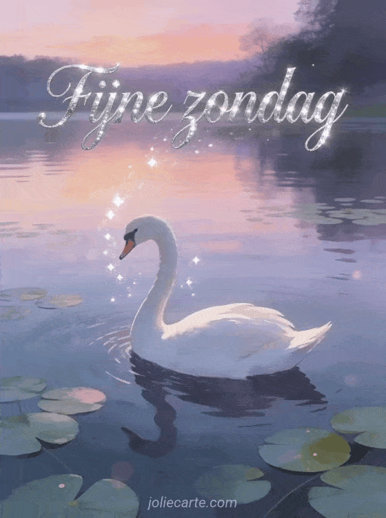 Deel geanimeerde gifs voor fijne zondag met elegante zilveren letters, een witte zwaan die over een kalm meer glijdt bij zonsopgang, roze en paarse weerspiegelingen en waterlelies. Ontdek ook goedemorgen zondag kaart of fijne zonnige zondag gif.