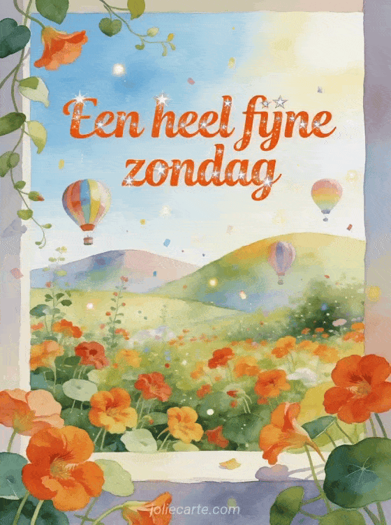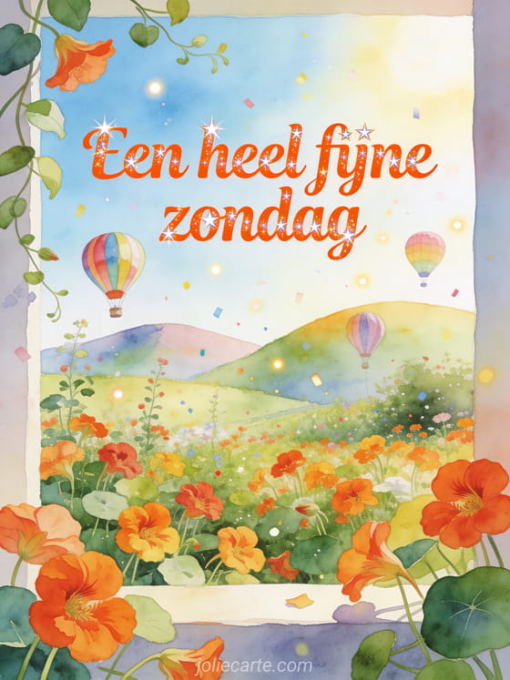 Stuur een feestelijke zondagwens met een kleurrijke luchtballon boven een zonnige tuin vol capucienbloemen. Bekijk ook zondag kusjes afbeelding, fijne zondag kaart of korte tekst om een fijne zondag te wensen.