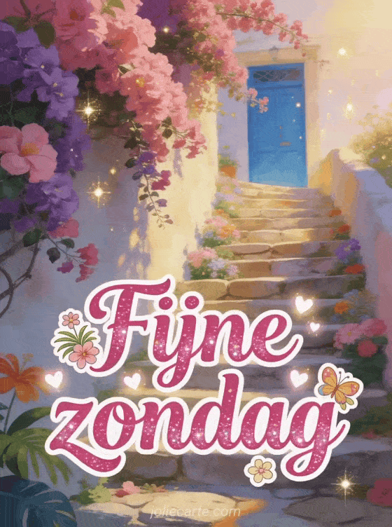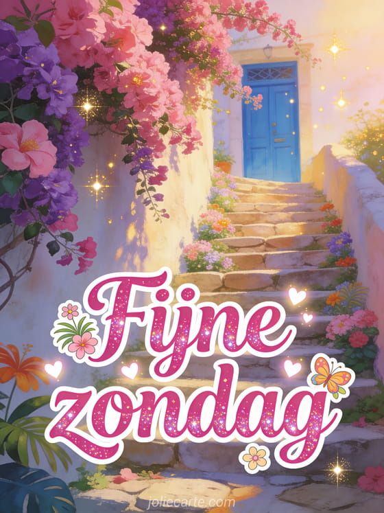 Stuur een lichtgevende zondaggroet met fonkelende fuchsia letters, tropische bloemen, stralende hartjes en een bloemrijke stenen trap naar een blauwe mediterrane deur onder watervallende bougainville. Bekijk ook deze fijne zondag kusjes humor, deze een fijne zondag doorbrengen of deze hele fijne zondag kusjes.