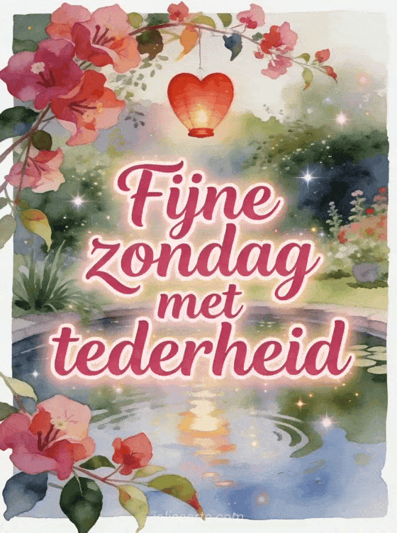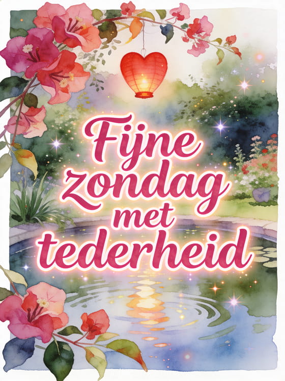 Deel fijne zondag met tederheid met frambooskleurige letters, een rode hartlantaarn boven een rustige tuinvijver en bougainvillebloemen over de rand. Ontdek ook goedemorgen zondag afbeeldingen, hele fijne zondag afbeeldingen of fijne zondag vrienden afbeeldingen.