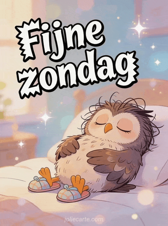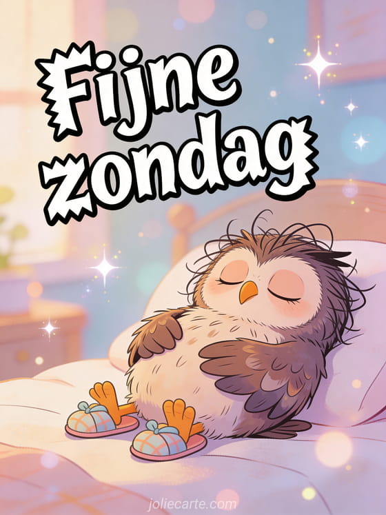 Stuur een luchtige zondaggroet met gekke cartoonletters en een slaperige uil met rommelige veren en kleine pantoffels. Ontdek ook fijne koude zondag afbeeldingen, goedemorgen fijne zondag gif of goedemorgen fijne zondag kaart.